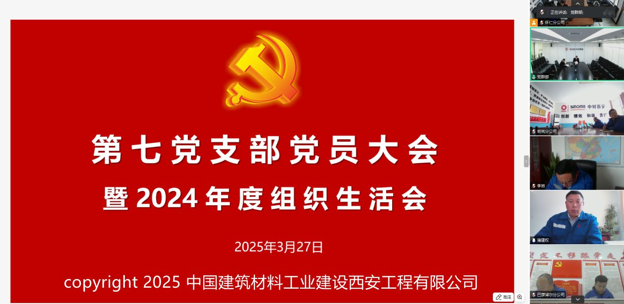 根據(jù)公司黨委《關(guān)于召開2024年度中材西安基層黨組織組織生活會和開展民主評議黨員的通知》要求,第七黨支部于3月27日召開黨員大會暨2024年度組織生活會。支部黨建聯(lián)系人、公司黨委委員、副總經(jīng)理朱剛同志以普通黨員身份參加會議。會議由支部書記徐以華同志主持,支部14名黨員參加會議。